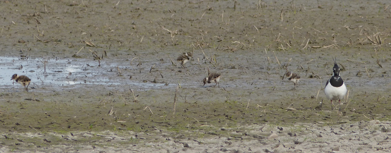 Im Nachhinein war klar,daß die Uferregion um die Wasserstelle geräumt werden musste, denn am 24.April wurden wir von vier nagelneuen, kerngesunden Kiebitzkücken empfangen. Sie tollten in einer Entfernung von etwa 15 Metern vor uns herum, natürlich immer unter der Obhut eines erwachsenen Tieres. Nun beobachteten wir „unsere“ Kinderschar täglich längere Zeit, bis man schon einige Lautäußerungen und Bewegungsmustern „übersetzen“ konnte. So war der Ruf zum Hudern bald zu identifizieren während ein anderer Ruf Alarm bedeutete und letztendlich auch die gesamte Kinderschar unter die Flügel trieb.